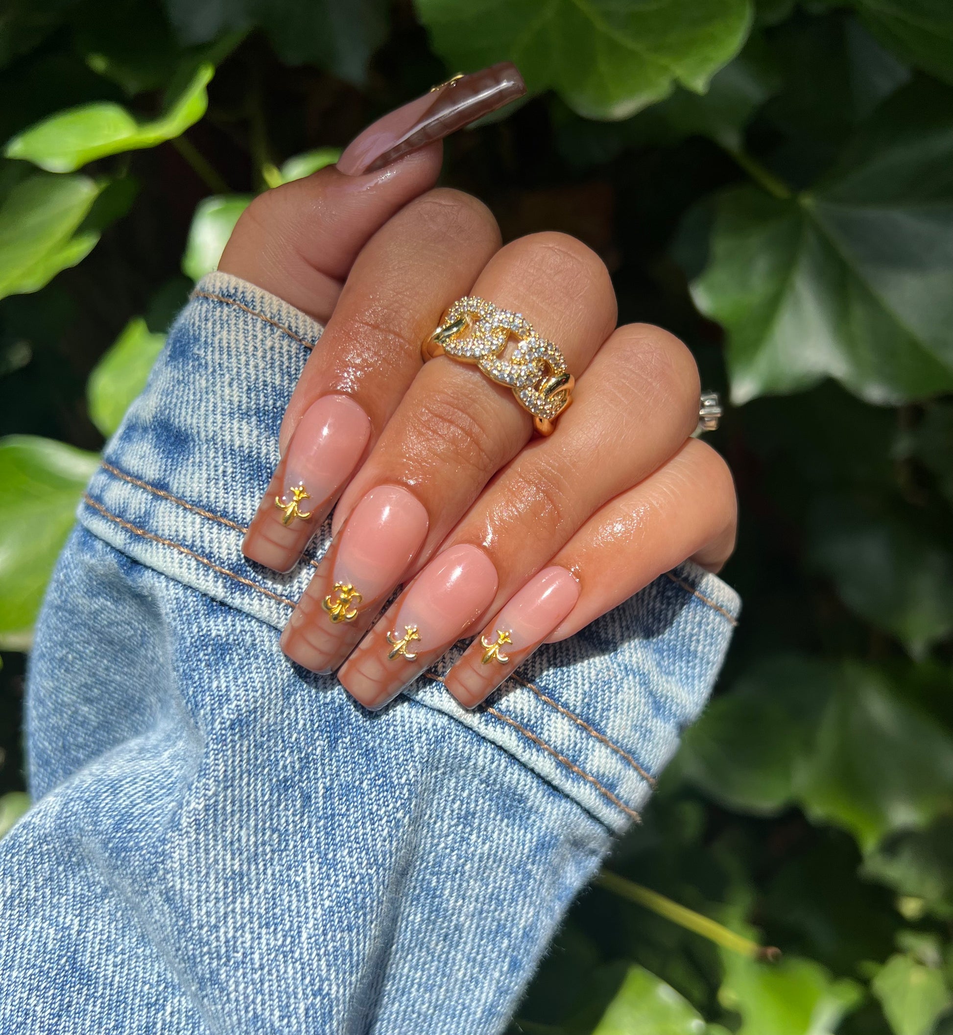A nude with white brown French wit’s crock and gold charms