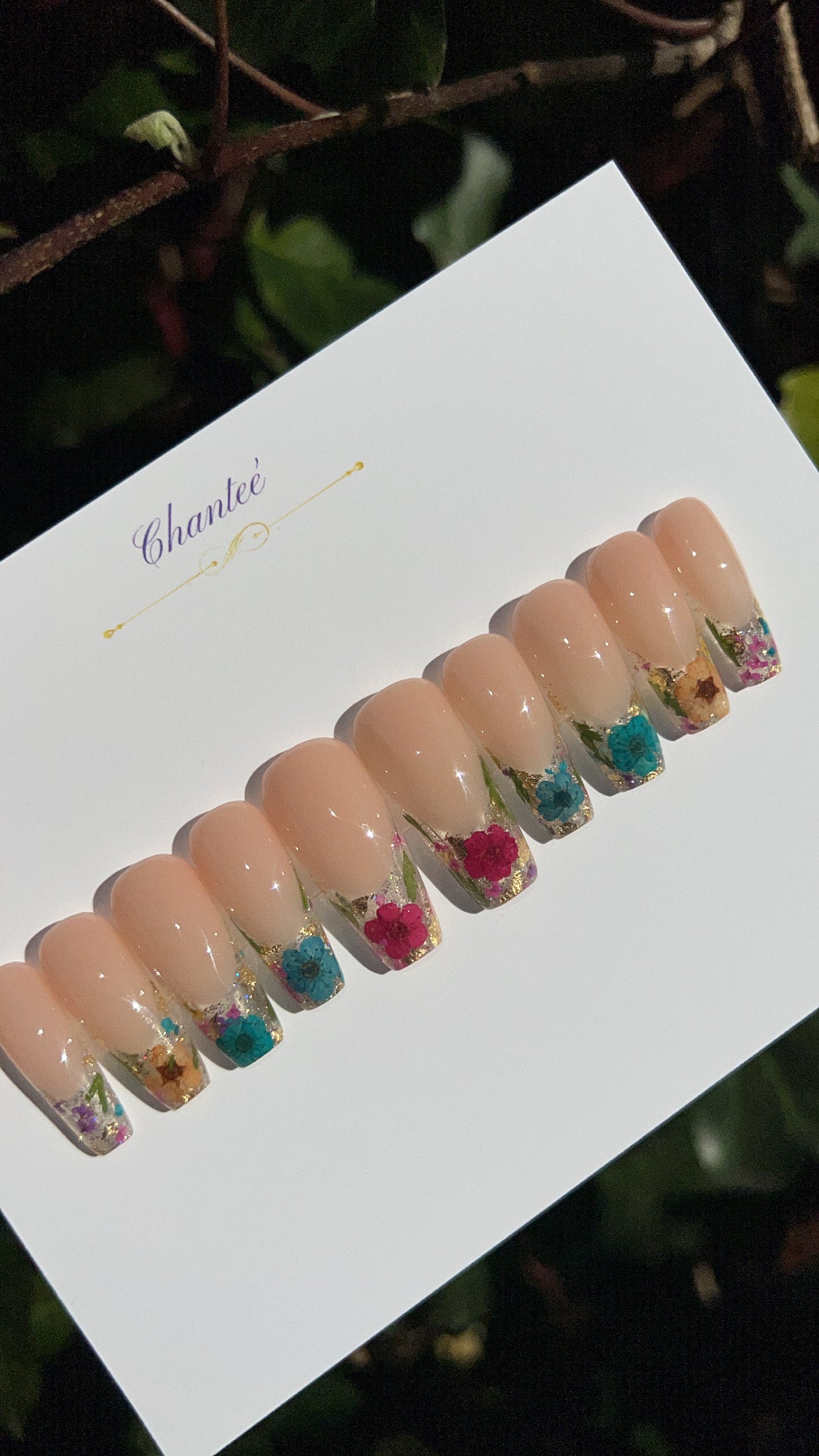 Freestyle hard gel nude with real encapsulated flower and gold French. Topped with gloss perfection