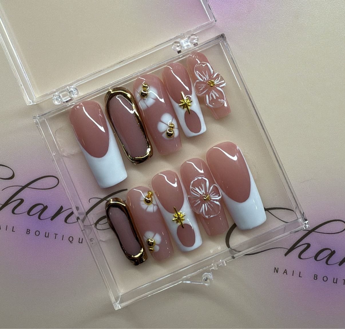 A Beautiful nude with white and gold elegant freestyle please note extra short and short will have alternative French designs for circle star designs finger as design may not fully fit